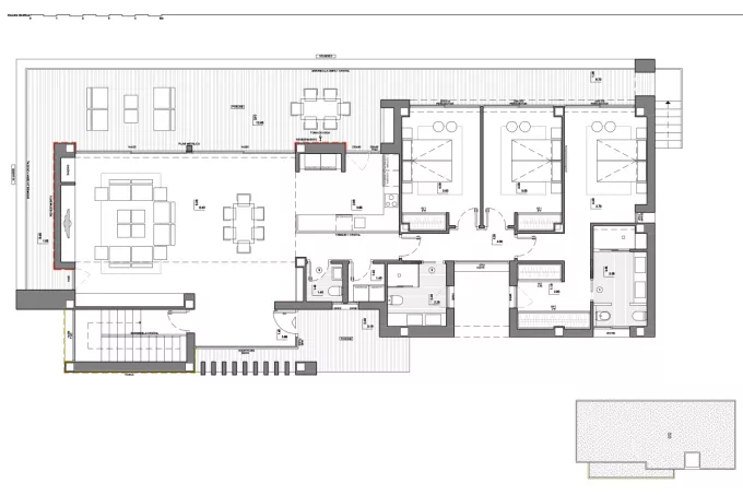 Villaen består av to høyder, hovedinngangen ligger i toppetasjen, med to tydelig differensierte fløyer. På høyre side har vi hvileområdet, hvor de 3 soverommene ligger, ett av dem med en stor garderobe og eget bad, de to andre med felles bad og romslige garderober, alle med direkte tilgang til terrassen og havutsikten. I den andre fløyen finner vi oppholdsrommene, med kjøkken tilknyttet spisestuen og utendørsverandaen, stuen, et gjestetoalett, et vaskerom, osv.