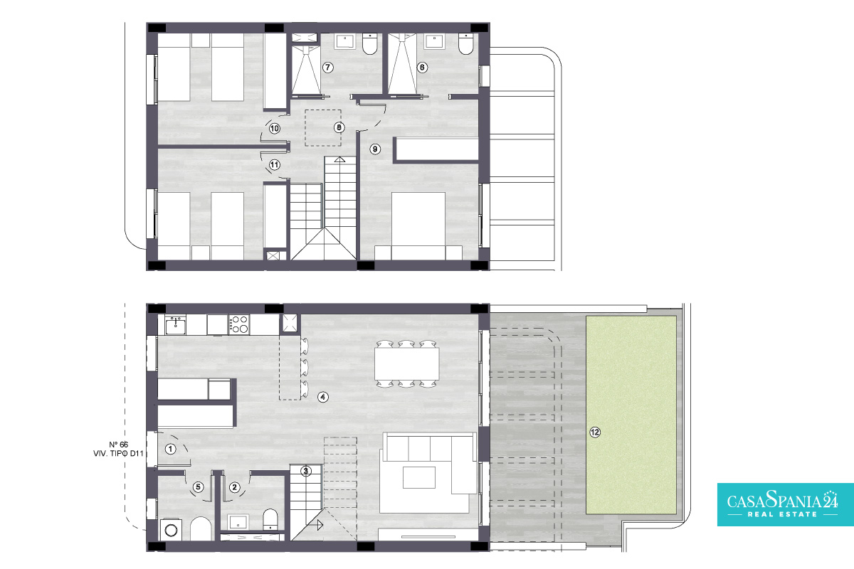 Duplexleilighet med 3 soverom, 3 bad, kjøkken med utgang til spisestue og stue. Leiligheten har også en 38 m² terrasse, privat parkeringsplass og bod.